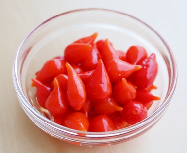 ユニークなしずく形をした赤色ペッパーの甘酢漬けです。見た目がキュートな「しずく形」と、ビビットな赤色を活かして、ピザやサラダのトッピングに、肉料理等の付け合せ、ピンチョス等にも幅広くご利用いただけます。