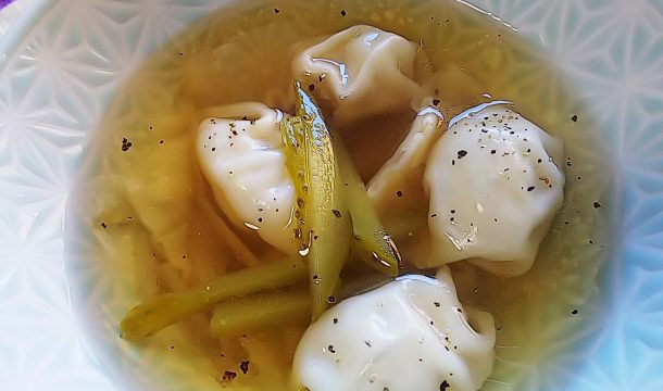 (3) 器に盛りつけたワンタンスープにディルピクルスをトッピングする。黒こしょうを上から振る。